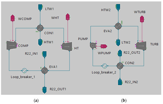 During periods of electric energy scarcity, the discharge phase at the HE cycle (Figure 2b) is activated. Liquid CO2 at a subcritical state enters PUMP and is compressed isentropically using work (WPUMP). The CO2, having reached its maximum pressure in the cycle, enters the evaporator EVA2, flowing isobarically and in a counter current manner to the water, which enters EVA2 from stream HTW2 from the hot-temperature water tank that was being stored. The hot water releases its stored sensible thermal energy to the CO2 and exits the EVA2 at a reduced temperature at stream LTW2 from where it is stored to the cold-temperature water tank. The CO2 exits the EVA2 at its maximum temperature in the cycle, having absorbed the sensible thermal energy, and it then proceeds to enter the turbine TURB, where it expands, producing useful work (WTURB) that can then be converted to electric energy and be provided to the network. The CO2 exits the TURB at a subcritical state and flows through the condenser CON2 isobarically and in a counter current manner to the R-22, which enters the CON2 from stream R22_IN2. The CO2 exits the CON2 at a liquid phase, having released latent heat to the R-22, and the HE cycle closes at the block Loop_breaker_2. Similarly, the R-22 exits the CON2 at stream R22_OUT2, having absorbed latent heat and is stored within the cold TES medium tank.