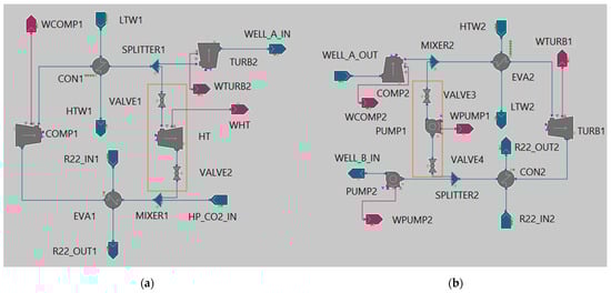 The operation of each of the two cycles (HP, HE) and the flow of the working fluid (CO2) occurs between two pressures, a minimum (PHP, min, PHE, min) and a maximum (PHP, max, PHE, max), since the condensation and evaporation processes in each cycle are isobaric [9]. For the maximum pressures (PHP, max, PHE, max), these must be above the supercritical point (73.8 bar) since the cycles are transcritical; however, they should not exceed a level above which turbomachinery and cost constraints will appear. At the same time, the maximum pressures and their corresponding temperatures should be such that the water as the secondary fluid will remain in a liquid state for its chosen operating pressure. For the minimum pressures (PHP, min, PHE, min), these must be such that the CO2 is in a subcritical state around the saturation line, since, when flowing through EVA1 (HP) and CON2 (HE), it needs to go through the phase change process, exchanging latent heat with the secondary fluid (R-22). At the same time, the selected minimum pressures should be such that the corresponding CO2 temperatures are around 0 °C, close to the phase changing temperature of the secondary fluid R-22 at a pre-defined operating pressure. Finally, it should be noted that in the second configuration (Figure 3a), for the expansion process to take place in turbine TURB2, PHP, max needs to be equal or higher than PWELL_A_IN. In the same manner, in Figure 3b, for the compression process to take place in compressor COMP2, PWELL_A_OUT needs to be lower or equal to PHE, max.
