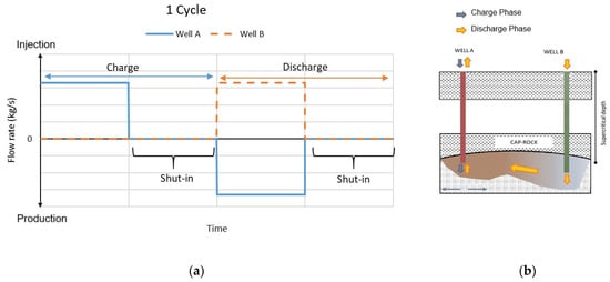 The aforementioned assumptions simplify the proposed system and may affect its performance. In terms of points one and two above, potential impurities in the CO2 or chemical reactions could alter the round-trip efficiency. With regard to the reservoir pressure and given the system and reservoir’s time scales (hours versus years), the assumption of constant reservoir pressure can be considered appropriate. Moreover, the potential energy losses due to flow dynamics—even if these dynamics were considered—would remain small, and as such, not lead to significant losses. Finally, in terms of the compression work that would be required in practice for the injection of the CO2 in well A, that would have an impact on the optimal value of the round-trip efficiency. A full cycle of an energy storage scenario of the CEEGS is presented in Figure 4a with shut-in periods included. In Figure 4b, a graphical representation of the charge and discharge phases within the below-surface formation, as described previously, is shown. At wellhead A, both injection (charge phase) and production (discharge phase) are conducted, while at wellhead B only injection occurs (discharge phase).