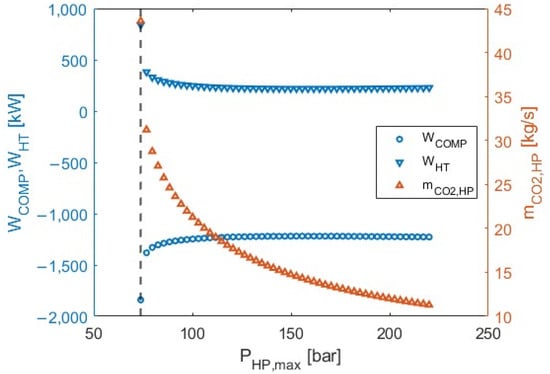 Parametric sensitivity analysis results: Variation of WCOMP, WHT, and ṁCO2, HP versus PHP, max (Dashed vertical line corresponds to the critical pressure of CO2: PHP, max = 73.8 bar).