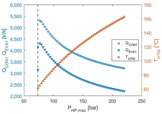Parametric sensitivity analysis results: Variation of QCON1, QEVA1, and THTW versus PHP, max (Dashed vertical line corresponds to the critical pressure of CO2: PHP, max = 73.8 bar).