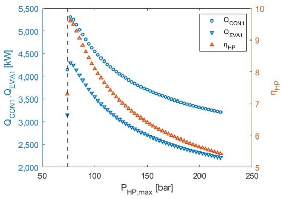 Parametric sensitivity analysis results: Variation of QCON1, QEVA1 and ηHP versus PHP, max (Dashed vertical line corresponds to the critical pressure of CO2: PHP, max = 73.8 bar).