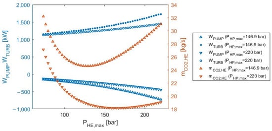 In terms of the operation of the discharge cycle (HE), as the maximum pressure of the cycle (PHE, max) increases, the works of both the pump, WPUMP, and the turbine WTURB increase in absolute values with the net capacity (Wnet, HE), however, remaining fixed through the adjustment of the cycle’s mass flow (ṁCO2, HE). The ṁCO2, HE with the increase of PHE, max will first decrease, reaching a minimum value, and then start increasing again. The above observations are depicted in Figure 8, where the variation in the WPUMP, WTURB, and ṁCO2, HE against the PHE, max is shown for two different values of PHP, max at 146.9 bar and 220 bar. Comparing the values of the three variables (WPUMP, WTURB, ṁCO2, HE) for the two different values of PHP, max it is observed that for higher values of PHP, max there is less variation in the values of WPUMP and WTURB with the increase of PHE, max. In terms of the ṁCO2, HE as PHP, max increases the mass flow of the cycle moves to lower values.