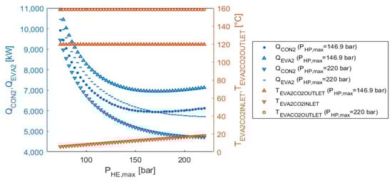 In Figure 9, it is observed that the temperature at the outlet of EVA2 (TEVA2_CO2_OUTLET) is not affected by the variations of PHE, max. TEVA2_CO2_OUTLET is only affected by the increase in the temperature of the hot water (THTW) through the transfer of sensible heat caused by the increase of PHP, max (Figure 6). The increase of PHE, max only results in the increase in the temperature of the CO2 at the EVA2 inlet (TEVA2_CO2_INLET). QEVA2 decreases before reaching a minimum and then slowly increasing again due to the similar pattern of the ṁCO2, HE and the increase of TEVA2_CO2_INLET. Similarly, the same behavior is observed for QCON2 due to the profile of the mass flow and the decrease in the temperature of the CO2 at the CON2 inlet (TCON2_CO2_INLET). Finally, with regard to both QEVA2 and QCON2, it is shown that with higher PHP, max values, the heat duties towards the higher values of PHE, max plateau and slightly keep decreasing instead of increasing.