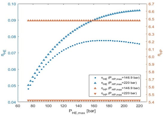 In Figure 10, ηHE and ηHP versus PHE, max are presented. In terms of the efficiency of the HE cycle ηHE (Equation (2)) similar to the ηHP, since the Wnet, HE is fixed, it is only dependent on QCON2 and QEVA2. As the two heat duties decrease with the increase in PHE, max, ηHE increases. Also, moving from lower to higher values of PHP, max, ηHE achieves higher values, especially at the upper end of the explored range. ηHP, as it has already been mentioned, is not affected by changes in PHE, max, and it increases only through the decrease of PHP, max. ηHE achieves its maximum value of 0.096 when both sensitivity analysis variables have a value of 220 bar. Finally, it can be concluded that the two efficiency metrics of the two cycles ηHP and ηHE cannot achieve optimal values simultaneously through the variation of PHP, max since the sensitivity analysis variables’ variation leads to opposite results for each metric.