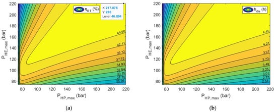 The round-trip efficiency of the overall system (ηR-T), that is the integrated two-cycle above-surface system, is presented in Figure 11a. It is observed that the highest values of the ηR-T are achieved when the values of the sensitivity analysis variables move simultaneously towards the upper end of their range, namely 220 bar. The highest ηR-T of the system is 46.89%, which is accomplished for values of the PHP, max and PHE, max of 217.076 bar and 220 bar, respectively. Since the ratio of the capacity of the two cycles is 1 (Equation (3)) and since the duration of the HP cycle (hchar) is constant at 10 h, it is derived that it is the increase in duration of the HE cycle (hdis) that causes the increase in the ηR-T (Figure 11b). The duration of the discharge cycle (Equations (7)–(9)) depends on the heat duties at the four heat exchangers of the system. As it has already been observed (Figure 6 and Figure 9), for higher PHP, max and PHE, max, all heat duties decrease, however the rate of decrease for QCON2 and QEVA2 is faster compared to QEVA1 and QCON1, respectively, resulting in the increase in hdis. For the best ηR-T, hdis, hs was calculated as 5.61 h and hdis, cs as 4.69 h with the final hdis being 4.69 h. This means that the 16.4% of the thermal energy of the hot TES tank was not used. Finally, ηHP and ηHE were calculated, respectively, as 5.45 and 0.095, with the value of the former being close to the lowest ηHP observed, and the value of the latter being close to the highest ηHE, which leads to the conclusion that favorable performance of the operation of the HE cycle coincides with the favorable performance of the whole system.