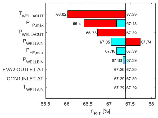 For the optimal ηR-T results, those of Case study 2, an additional parametric sensitivity analysis was conducted to understand the degree to which the most critical parameters of the system affect the ηR-T of the system. The variables for which their effect is evaluated are the maximum pressures of the two cycles (PHP, max, PHE, max), as well as the parameters related to the geological storage conditions (PWELL_A_IN, TWELL_A_IN, PWELL_A_OUT, TWELL_A_OUT, PWELL_B_IN). Two other parameters included in the analysis are the temperature differences at the inlet of CON1 and the outlet of EVA2. Each sensitivity analysis variable varied in the analysis compared to the values corresponding to the optimal ηR-T by +1/−1 percentage points, where that was feasible. In Table 8, the sensitivity analysis variables, along with the values explored, are shown.
