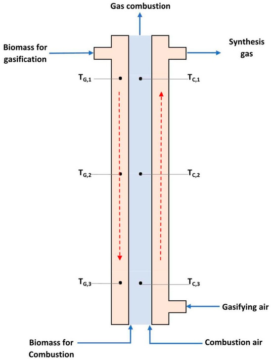 Figure 1 represents a concentric tube gasification reactor. This figure, the red arrows on the left and right indicate the movement direction of biomass and volatiles, respectively. The reactor consists of two concentric tubes, with the inner tube serving as the biomass combustion zone to produce the necessary heat for gasification, while biomass gasification occurs in the annular space. Six thermocouples were installed as shown in this figure—three in the gasification zone (i.e., TG1, TG2, and TG3) and three in the combustion zone (i.e., TC1, TC2, and TC3). The temperatures were measured using K-type thermocouples with an accuracy of ±1.5 °C and an Omega TC-08 data acquisition module, with a sampling rate of 10 readings per second and a measurement range of −270 to 1820 °C. To report data only under steady-state conditions, the reactor was ignited, and measurements were delayed for a few minutes until temperature fluctuations were less than ±2 °C. Once this stability was achieved, the temperature data were averaged to minimize the impact of small residual fluctuations. This approach ensured that the measurements reflected stable process conditions, which is crucial for the accuracy of the results.