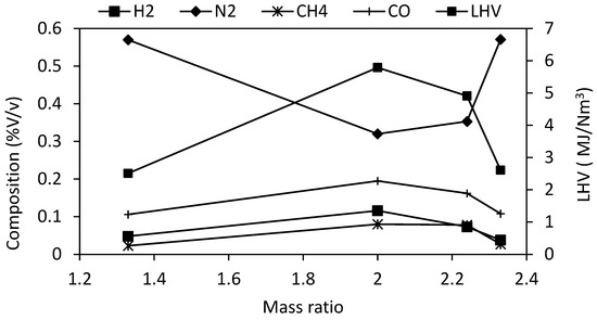 The results show that the highest LHV of syngas is obtained for a mass ratio of 2, because of the lower share of N2 and the higher shares of H2, CH4, and CO in syngas contrasted to lower or higher ratios.