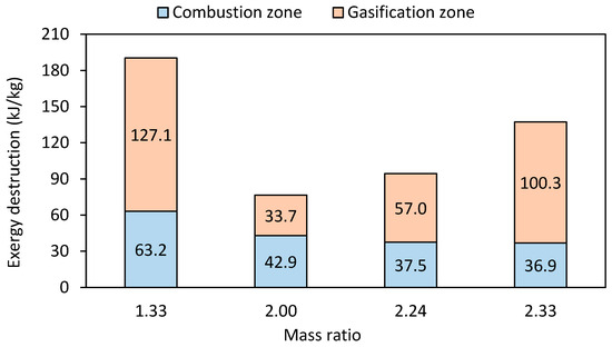 Exergy destruction in the reactor by mass ratio in the gasification zone.
