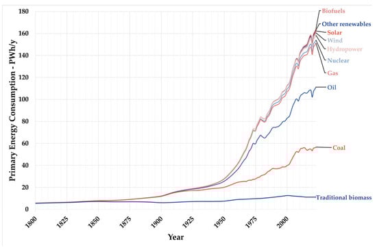 Global primary energy consumption by source (in PWh/y—P: Peta) since 1800—data from [6].
