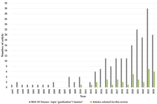 A search on the Web of Science on the topic of “gasificationANDmarine” leads to a total of 196 articles. With a research timespan from 1900 to 2024, articles with the topic “gasificationANDmarine” are only found starting from 1997, as presented with grey bars in Figure 2. Some of the articles are about LNG (gasification phenomenon on ships, reliquefaction), some about computational solvers (marine predators), and some about marine placers, which refer to mining. With the search on the topic of “gasification AND marine NOT LNG NOT predator NOT placer NOT liquefaction”, there are about 150 articles found on the Web of Science Core Collection.