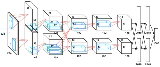 Figure 1, it features a parallel structure designed to perform computations using two GPUs and consists of eight layers, including five convolutional layers and three fully connected layers. By adopting a rectified linear unit (ReLU) instead of traditional activation functions like sigmoid or tanh, AlexNet enhances learning speed. To address overfitting, it applies data augmentation techniques and uses dropout to randomly omit neurons during training [