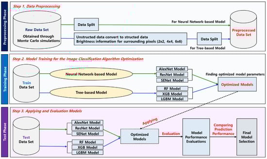 In this step, we perform model training to optimize the image classification algorithm. In this study, we selected ResNet, AlexNet, and SENet, which are neural network-based algorithms that have shown good performance in previous studies, to optimize their model parameters. We also included XGBoost, random forest, and LightGBM, which are tree-based ensemble algorithms known for their high classification performance, to evaluate the applicability of AI algorithms.