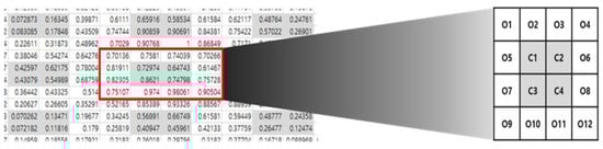 Figure 8 visualizes the data for the 4 × 4 scenario, using four brightness values (C1, C2, C3, C4) from the 2 × 2 pixel area and twelve surrounding pixel brightness values (O1, O2, …, O11, O12) as independent variables. The dependent variable is the presence (no defect: 1) or absence (defect: 0) of a fuel rod at each position.