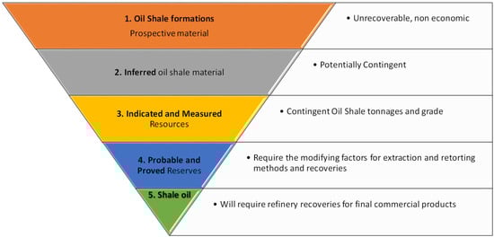 The global quantity of oil shale resources has been estimated using various methods, though detailed methodologies for assessing commercial shale oil reserves are often lacking, where most attempts to estimate oil shale resources have relied on limited or unreliable data. Geological resources represent the total quantity of an oil shale material present on the Earth, regardless of whether it is economically or technically extractable. In contrast, shale oil reserves are the portions of the geological resources that are economically and technically viable to extract under current market conditions, technologies, and regulations. Thus, the economic potential of oil shale can be overestimated if it is based only on mineral resources and not considered extractable oil reserves. Factors like market prices, extraction costs, technical and technological advancements, environmental regulations, and infrastructure availability are critical in determining whether geological resources can transition into economically viable reserves [1,2,3,4,5].
