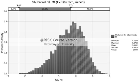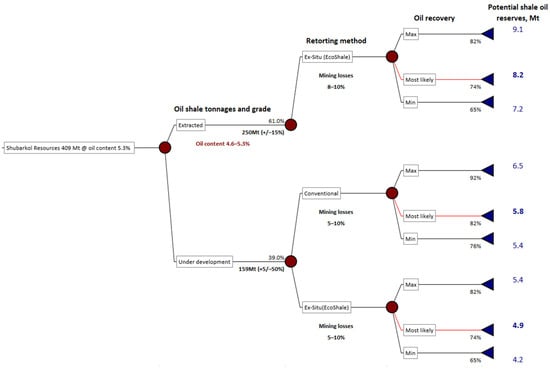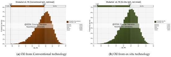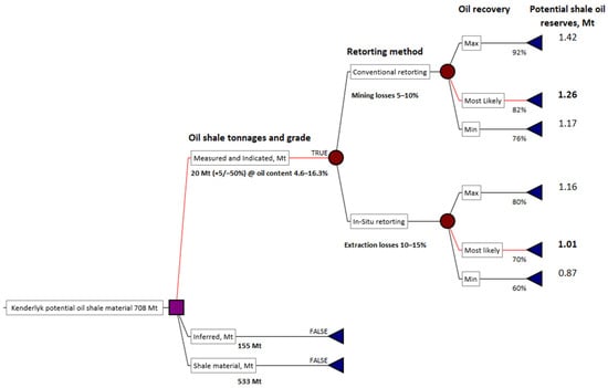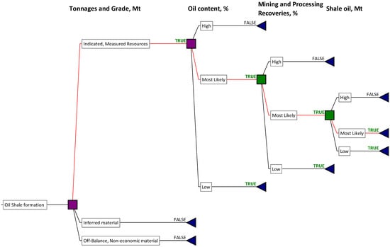 Event tree analysis presented in Figure 6 shows potential shale oil tonnages that can be produced using conventional retorting and unconventional in situ retorting technologies. The event tree considered (TRUE) only for the high resources category (Indicated and Measured) for estimation of oil recoveries and mining (extraction) losses. Inferred materials of 155 Mt and 533 Mt have no value and, therefore, are added to the event tree as FALSE-ended branches. Mining losses are assumed to be 5–10%, which is typically accepted for conceptual-level estimations and proved by industrial expertise. Extraction losses for in situ retorting are assumed to be 10–15% [26,27,28]. Retorting recoveries are summarized in Table 2 and analyzed using Monte Carlo modeling in Figure 4, which was used for the event tree analysis shown in Figure 6.