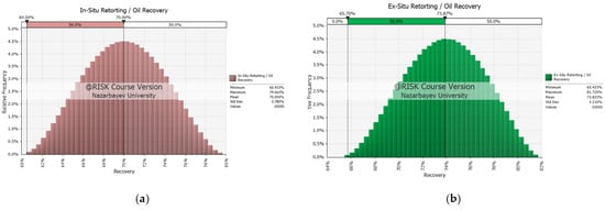 Considering the retorting recoveries specified in Table 2, Monte Carlo simulation produces possible outcomes for the in situ and the ex situ retorting technologies. Industrially proved conventional retorting Galoter type has a range of oil recoveries of 76–92% at a 90% confidence level [7]. The in situ retorting recoveries are estimated in the range of 61–70%, and the ex situ recoveries have a range of 66–74%, only at 50% or lower confidence level (Figure 4). The lack of industrially proven projects generates low confidence levels on recoveries for unconventional methods.