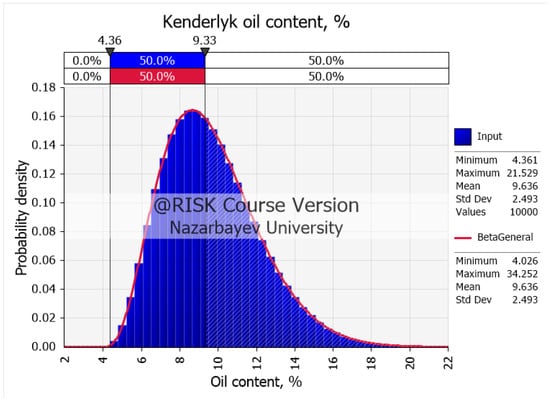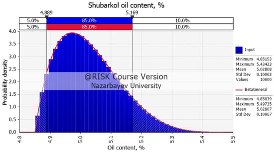 The Kendyrlyk oil shale deposit contains 708 Mt of some oil shale material. from which 155 Mt are oil shales of the Inferred category and 20 Mt are estimated as Measured and Indicated according to the ‘GKZ’ category (A + B + C1). Oil content was considered for many different seams and has not been presented at an average value for the specified tonnages. Thus, it has been run through the Monte Carlo simulation and showed a range of oil content from 4.4 to 9.3%, which is well fitted with the Beta General distribution (Figure 5).
