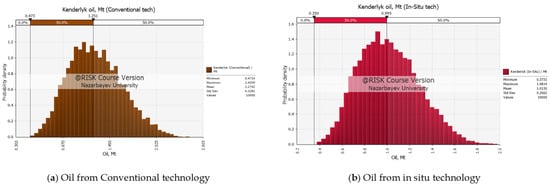 As a result, for the conventional retorting, the Most Likely branch shows that potential oil can be produced at a value of 1.26 Mt and for the in situ retorting at 1.01 Mt, accordingly (Figure 4). Figure 7 demonstrates the Kenderlyk potential shale oil tonnages from the conventional technology, which can be in a range of 0.5–1.3 Mt, and from the in situ technology, in a range of 0.4–1.0 Mt at a 50% confidence level.