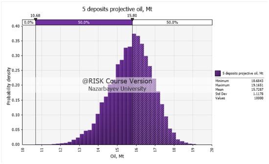 As a result, the methodology has been validated by these five oil shale deposits and demonstrated projected shale oil in a range of 10.7–15.8 Mt at a confidence level of 50% (Figure 12). The reliability of these findings can be evaluated by evidence of real data that supports the obtained values that were received from the operational open cast ’Shubarkol’, which produces regular lab test works and surveys on material movement. In addition, the developed methodology was validated on data from Estonian oil shale industrial operations, whose experience received over 50 years demonstrated reliable results [7]. For the particular oil shale deposits in Kazakhstan, evidence that supports the obtained values can be presented through additional exploration drilling and a detailed feasibility study because oil shales in Kazakhstan are not well explored, and there are no industrial applications. The methodology can propose necessary steps and provide a probable range of outcomes so that stakeholders can understand the values and not get confused with some other overestimated numbers. However, retorting recoveries must be proved for each specific oil shale type. This methodology does not consider any financial-economical estimations, which will require feasibility studies taking into account operational and capital expenses, product sale prices and market, and social- environmental aspects.