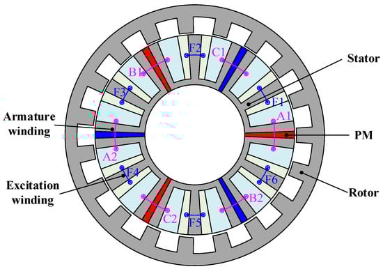 Figure 1 illustrates the topology of a three-phase 6-stator-pole/19 rotor-tooth (6/19) E-core OR-HEFS machine investigated in this paper. It can be observed that the rotor consists of 19 salient poles which are sample and robust. The stator is composed of 6 E-core cells, 6 pieces of PMs, 6 armature coils, and 6 excitation coils. Each E-core cell has three teeth; the middle tooth is denoted as the fault-tolerant tooth and the others are the stator teeth. Meanwhile, each piece of the PM is sandwiched by two armature teeth belonging to different E-core cells, and these three parts collectively form a stator pole. Both the armature coils and excitation coils are concentrated coils, they are wounded on stator poles and fault-tolerant teeth, respectively. In addition, the magnetization directions of the two adjacent PMs are opposite, and the “flux-concentrated” effect helps improve the torque density.
