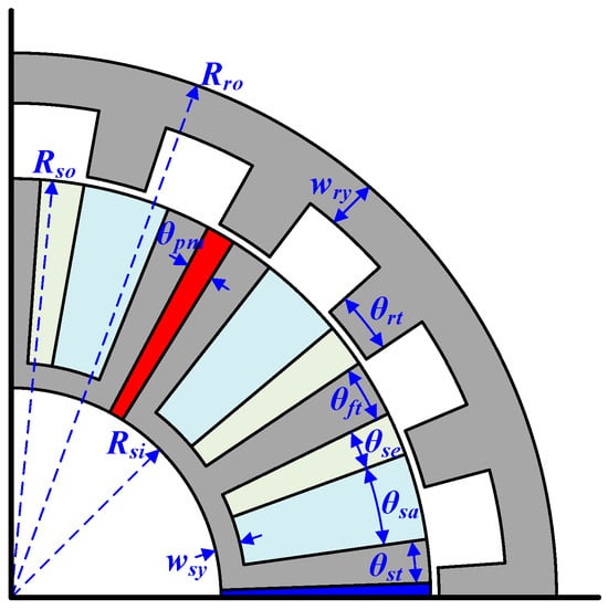 However, according to the conclusions drawn in [], E-core OR-HEFS machines usually possess high torque per PM amount, and the PM arc can be reduced to increase the slot area. Moreover, the fault-tolerant tooth arc is expected to be larger to enhance the flux regulation capability []. Therefore, these two arc parameters should be modified as follows: