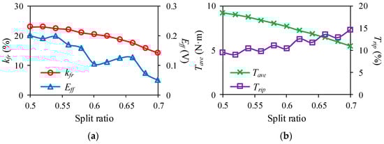 Variation in output performances versus the split ratio. (a) Influence on kfr and Eff; (b) influence on Tave and Trip.