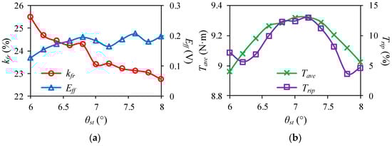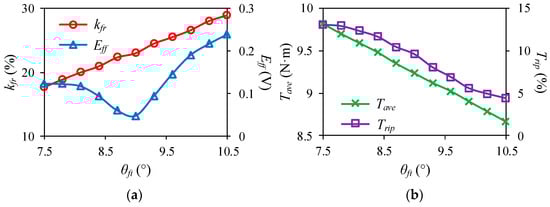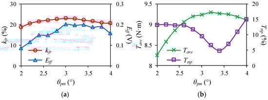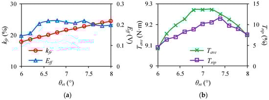 Variation in output performances versus the rotor tooth arc. (a) Influence on kfr and Eff; (b) influence on Tave and Trip.