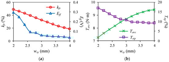 Variation in output performances versus the stator yoke width. (a) Influence on kfr and Eff; (b) influence on Tave and Trip.
