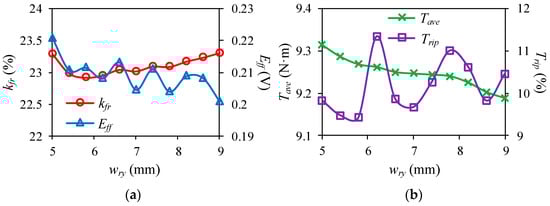 Variation in output performances versus the rotor yoke width. (a) Influence on kfr and Eff; (b) influence on Tave and Trip.
