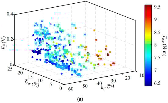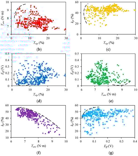 Figure 11a illustrates the feasible design of the 6/19 E-core OR-HEFS machine. The color of the design points denotes the value of the average output torque. Additionally, Figure 11b–g demonstrates the Pareto frontier between two output performances. The optimal design was chosen on the Pareto frontier, where all solutions were not dominated by each other but not optimal to all the objectives. Finally, the choice of the solution depended on the importance of each objective, and the parameter and corresponding performances are listed in Table 2. It should be noted that the optimized machine improved the Tave from 9.14 N·m to 9.64 N·m, reduced the Trip from 9.60% to 3.95%, increased the kfr from 18.4% to 19.5%, and reduced the Eff from 0.81 V to 0.56 V.