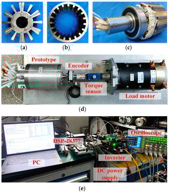 The prototype and testing rig of the 6/19 E-core OR-HEFS machine. (a) The stator core; (b) the rotor core; (c) the stator; (d) testing rig; (e) control platform.