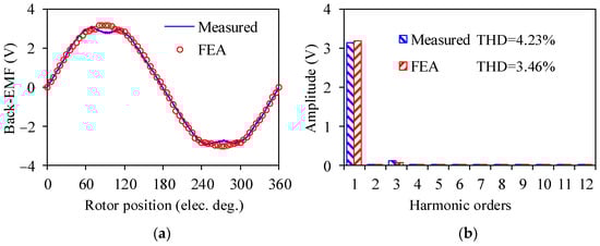 The measured back electro-motive force (back-EMF) is shown in Figure 13, which maintained great consistence with the finite element analysis (FEA) result. The prototype was driven to 120 r/min by the DC motor with a 5 A/mm2 excitation current injected. Compared to the FEA result, the measured back-EMF contained a more significant third harmonic, which was caused by the positioning keys of the slot wedges in the prototype. Therefore, the total harmonic distortion (THD) of the measured back-EMF was 4.23%, which is slightly larger than the FEA result (3.46%).