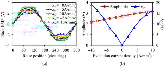 When injecting different excitation currents, the measured back-EMF waveforms are illustrated in Figure 14, which can also reflect the flux-regulation capability. It should be noted that, the prototype keeps running at the speed of 120 r/min when the excitation current varies. In addition, the label “-” in the excitation current densities indicates the flux-weakened current. In the flux-weakened region, the amplitudes of back-EMF vary linearly with the excitation current, which proves the satisfactory flux-regulation capability of the E-core OR-FSPM machine. However, in the flux-enhanced region, the growth rate of the flux-regulation ratio decreases when the current density exceeds 6 A/mm2, due to the magnetic saturation effect in the stator core.