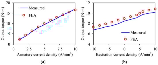 The measured torque under different load and excitation conditions is shown in Figure 15. In Figure 15a, the excitation current remained 5 A/mm2, and the armature current varied from 1 to 10 A/mm2 to test the overloaded capability. In Figure 15b, to test the flux-regulation capability, the armature current remained 5 A/mm2, while the excitation current varied from −10 to 10 A/mm2. Great agreement was achieved between the FEA and the measured results, and the maximum deviation was within 6% in the testing range. The main reason lies in the end effect ignored by the two-dimensional FEA, which leads to the increase in the FEA torque.