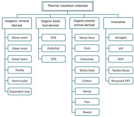 Classification of building insulation materials. Own elaboration based on [10]. Abbreviations: EPS: expanded polystyrene; PUR/PIR: polymeric chemically cured materials; XPS: extruded polystyrene; VIP: vacuum insulation panel; NIM: nano insulation material.