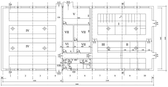 Scheme of the technological layout of the piggery. I: loose and gestating sows; II: lactating sows; III: piglets; IV: fattening pigs; V: forage room; VI: office; VII: technical rooms; VIII: sanitary sluice; IX: toilet (source: own elaboration based on [68]).