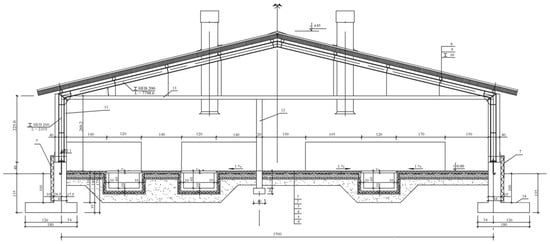 Figure 4 and Figure 5 show a drawing of the livestock building that serves as the model for these considerations. These diagrams were used to calculate the amount of building materials used. Internal walls separating the technical room from animal production are made from aerated concrete blocks. The subject of our further analysis is only external walls.
