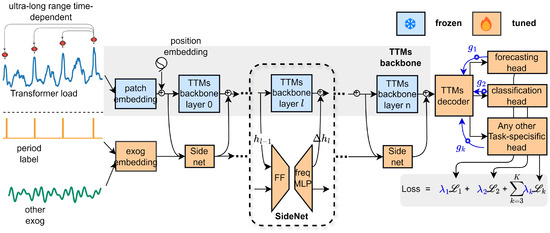 This paper explores PEFT to enable pre-trained backbone networks, i.e., TTMs, to handle multiple downstream tasks simultaneously. To achieve this, an end-to-end multitask fine-tuning framework called FreqMixer is proposed. The framework consists of a frozen TTM backbone, which interacts in parallel with a SideNet module at each layer, along with a TTMs decoder and multiple task-specific heads. The overall structure is illustrated in Figure 1. The backbone processes all target variables (labeled as “Transformer load” in Figure 1), while SideNet handles all covariates (such as period labels). The backbone and SideNet outputs are aggregated in each layer, and the aggregated result in the last layer is then passed through the decoder to obtain a shared representation between tasks, which is subsequently passed through each task-specific head to produce the desired outputs.