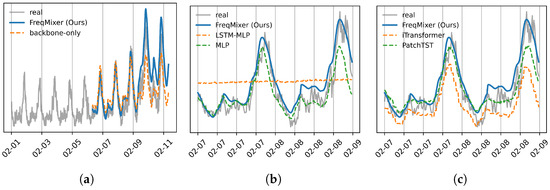 Model configuration. In this experiment, all models were trained with the context length set to T = 512 and the prediction length set to H = 288. The only exception is FreqMixer, which uses autoregression to predict 96 steps at a time. For FreqMixer, the number of layers of the model depends on its backbone, where three layers are used, each accompanied by a SideNet. The hidden feature size of the SideNet is 32, while the hidden state size of the backbone is fixed at 512 and cannot be modified. The baseline model was implemented using the Neuralforecast and Time Series library with the recommended hyperparameter settings. All models were trained using the same training setup, i.e., batch size b = 512, 50 epochs of training, and a learning rate of 0.001. During training, the first 6% of the steps was used as a warm-up. A quantum loss function (MQloss) was used with a quantum value of 0.8. Validation was performed at the end of each epoch, and an early stopping strategy was applied to avoid overfitting. Training was conducted using a 72-core CPU, 256 GB of RAM, and two H100 80 GB GPU platforms.