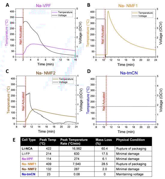 Temperature (left y-axis) and voltage (black, right y-axis) responses to 1500 psi pneumatic nail penetration indicated by a red dashed line for each Na-ion battery (A–D). (E) Table summarizing important parameters from each cell tested.