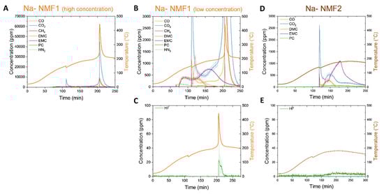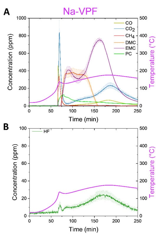 Beginning with the Na-VPF cell (Figure 6A), we observed a spike in the temperature ramp at ~100 °C, which was in conjunction with the detection of several gases. CO, CO2, and CH4 were detected in the range of ~300–800 ppm, which was indicative of material combustion. HF was also detected at 25 ± 5 ppm (Figure 6B). Following the first detected gases, carbonates were detected as the electrolyte was boiled through the now open cell vents. PC was detected first peaking at ~150 ppm, followed by DMC up to 400 ppm, and finally EMC up to 800 ppm. DMC and EMC present in order of their boiling points, 90 °C and 107 °C, respectively, but PC is observed well below its boiling point of 242 °C. As the test progressed, the cell was heated until 180 °C was reached, while CO, CO2 and HF evolved a second time with less intensity around 175 °C.