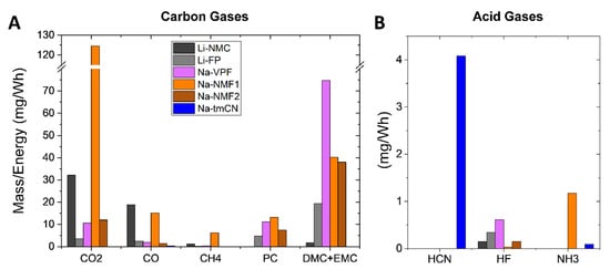 where V is the flow rate in g/m3, c is the concentration in ppm, M is the molar mass of the gas, and T and P are the pressure inside the gas cell in Kelvin and mbar, respectively. The flow rate is then multiplied by the mass flow through the gas cell in (m3/s) and the increments of time between measurements, 20 s, and summed over the duration of the test to obtain a mass. The mass of each detected gas was then normalized to cell energy in Wh in Figure 9. We note that for the Na-NMF, the concentrations of combustion gases are similar to Li-NMC, while for the Na-VPF and Na-NMF, the concentrations are similar to Li-LFP. Among the toxic gases analyzed, the most HCN is detected from the Na-tmCN cell, which contains CN in its unit cells. Similar concentrations (~10 ppm/Ah) of HF were detected from the Li-NMC, Li-FP, Na-VPF and Na-NMF cells. Finally, carbonates of similar concentrations were detected from the Li-NMC, Li-FP, Na-VPF and Na-NMF cells.