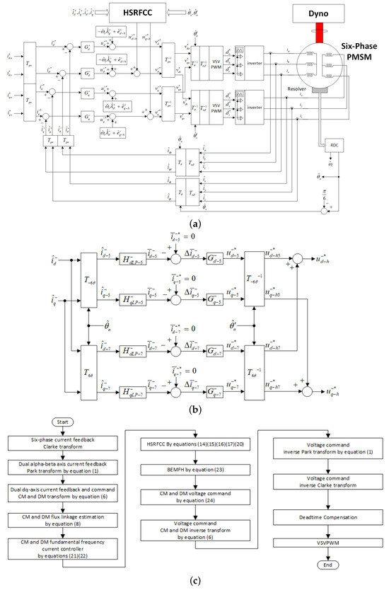 The control block diagram of the CM and DM current controllers, including the fifth and seventh HSRFCC and BEMFHFC: (a) the main block diagram; (b) expansion of HSRFCC; (c) flow chart.