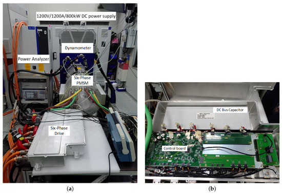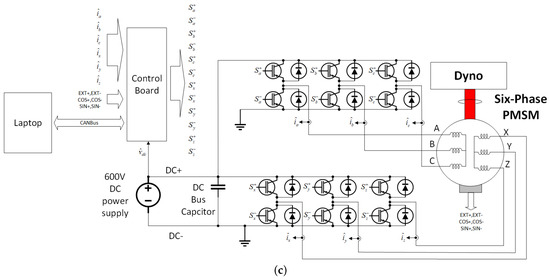 The test platform: (a) the dynamometer, six−phase drive, and six−phase PMSM; (b) inside of the six−phase drive; (c) electrical diagram of the drive, laptop, DC power supply, and dynamometer.