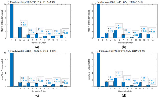 The harmonic spectrum and THD of measured phase currents , , and after using space BEMFHFC and HSRFCC: (a) ; (b) ; (c) ; (d) .