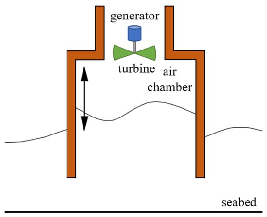 The structure of the OWC device is shown in Figure 1, which mainly consists of two parts: an air chamber structure with openings at the bottom of the submerged water and a PTO system mounted at the top of the air chamber for energy conversion. The incident wave vibrates the water column up and down inside the chamber, forcing the airflow to reciprocate. The airflow, which varies with the wave cycle, rotates the turbine, and a generator connected to the turbine converts the mechanical energy of the turbine rotation into electrical energy.