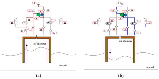 Schematic of the novel PTO system: (a) wave rising phase and (b) wave falling phase. 1.1–1.6: Check valves; 2.1, 2.2: accumulators; 3.1, 3.2: switching valves; 4: turbine; 5: generator; and 6: atmosphere.