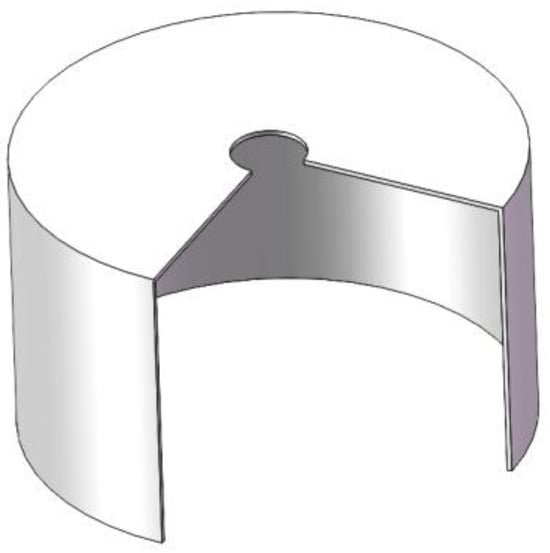 The primary structure of the OWC air chamber adopts a cylindrical configuration. A full-size model with , , was designed, which is well able to absorb full-size wave energy with periods in the range of 4s–7s. The simulation uses 1:10 scaling, so the radius R is 0.5 m, the total height is 0.6 m, and the wall thickness D of the air chamber is 0.01 m. The PTO damping is simulated by setting up an orifice above the air chamber [38], and the radius of the orifice is defined as . The 3D model of the device is shown in Figure 3.